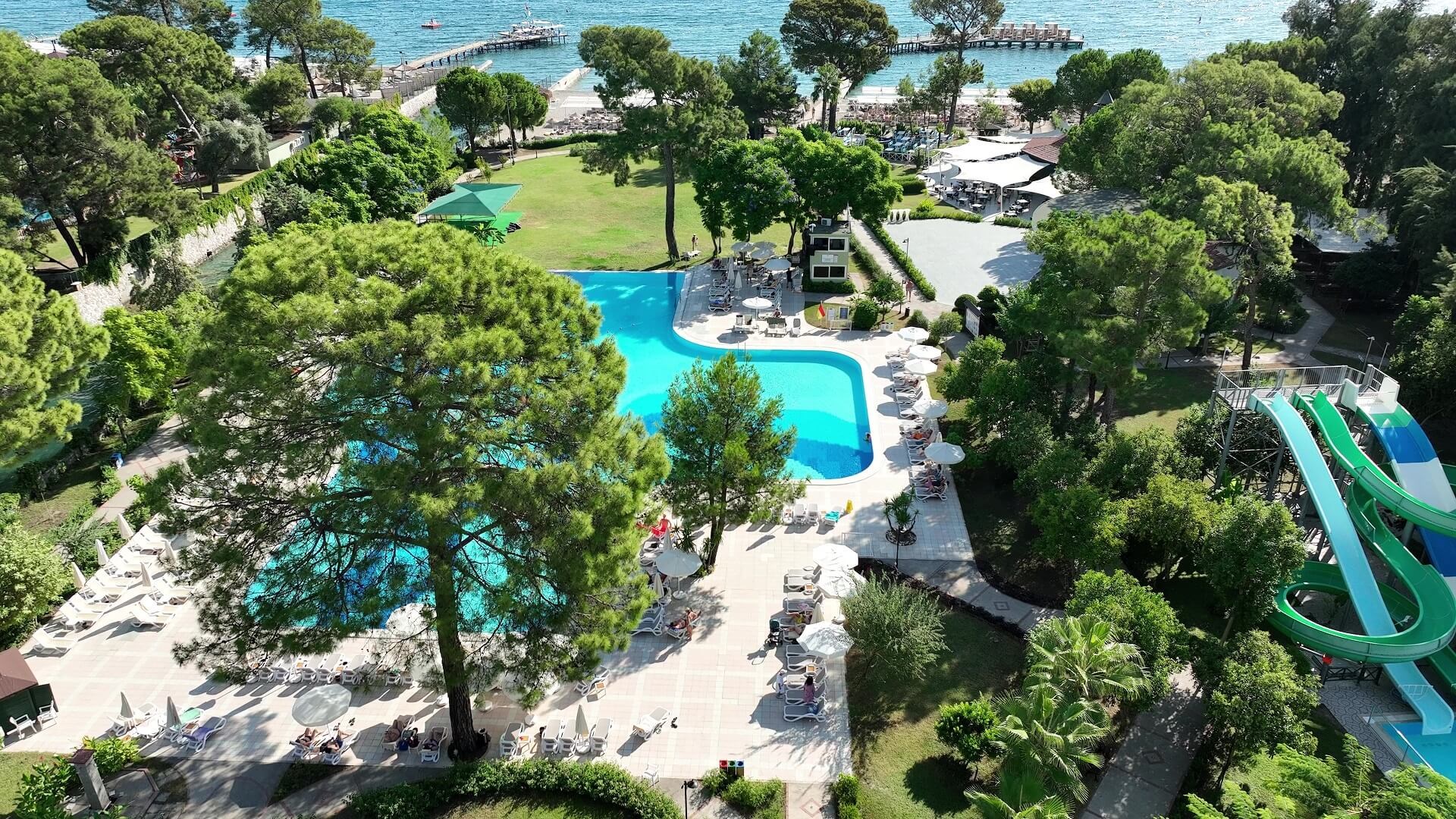 vstupná hala s recepciou, posedením a lobby barom • hlavná hotelová reštaurácia • 1 a´la carte reštaurácia (medzinárdoná kuchyňa) • snack bar • cukráreň • rozsiahly vonkajší bazén • relaxačný bazén • detský bazén • vnútorný bazén • bazén so šmykľavkami a toboganom • sauna • SPA a wellness centrum (masáže, turecké kúpele a peeling za poplatok) • kaderníctvo • fitness centrum • boccia • stolný tenis • šípky • plážový volejbal • basketbal • vodná gymnastika • minifutbal • tenisový kurt (príslušenstvo a osvetlenie za poplatok) • amfiteáter • ponuka rôznych vodných športov na pláži (za poplatok) • miniklub (pre deti od 4 do 12 rokov) • detské ihrisko • nákupná pasáž • wifi v lobby a v spoločných priestoroch