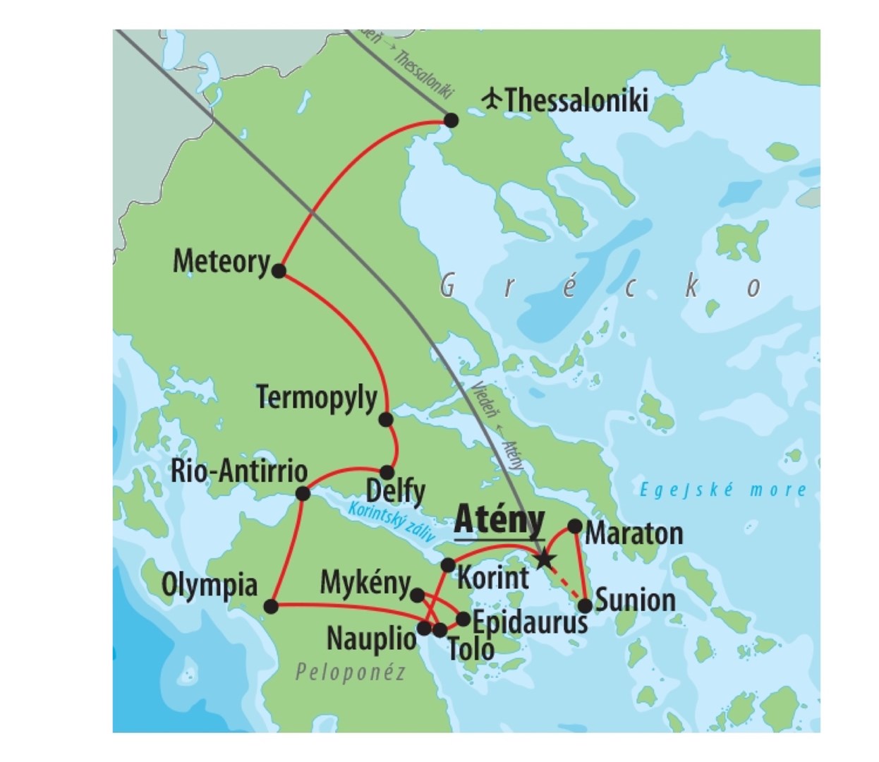 Thessaloniky - Meteory - Kalambaka - Delfy - Termopyly - Rio Antirio - Peloponéz - Olympia - Tolo - Epidavros - Nauplio - Korint - Atény - Maratón