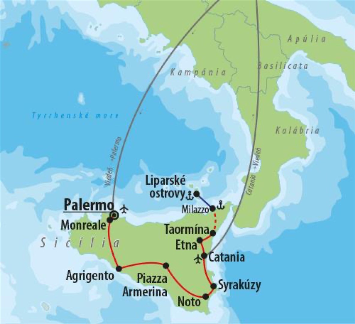 7. deň » Raňajky, v prípade časových možností, prehliadka Catanie. Odlet z Catanie do Viedne.