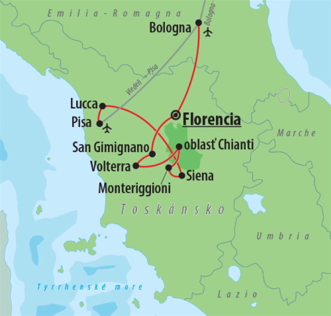5. deň » raňajky, posledný deň venovaný kráľovnej Toskánska - Florencii. Prechádzka mestom, v ktorom sa zrodilo obdobie rozkvetu umenia a vedy. O tento rozkvet sa zaslúžil rod Mediciovcov, ktorý mesto vďaka pozvaným umelcom premenil na galériu pod otvoreným nebom. Námestie Duomo s baptistériom, chrámom Santa Maria del Fiore a Giottovou zvonicou, most Ponte Vecchio, námestie Piazza Signoria s veľkolepým palácom a dnes radnicou Palazzo Vecchio a svetoznámou galériou Ufizzi, a ďalšie skvostné miesta. Transfer na letisko, odlet z Bologne do Viedne.
